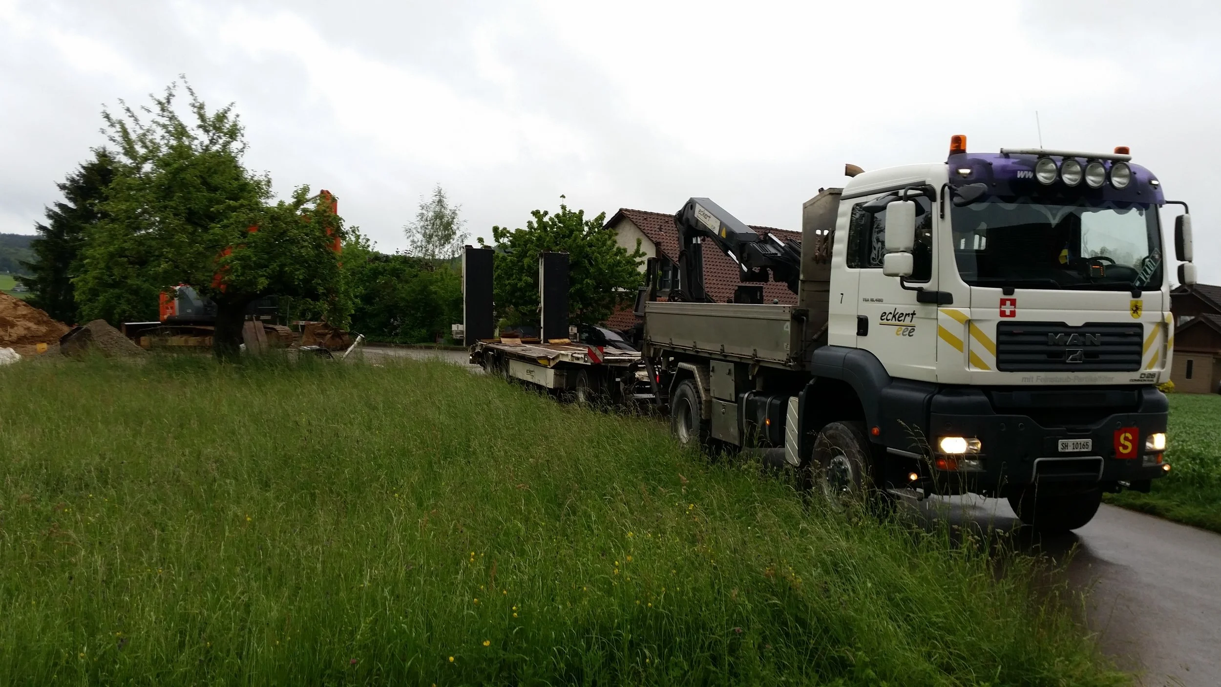 Diverse Lastwagen vom 2/3/4/5-Achser mit verschiedenen Krangrössen und Tiefganganhängergrössen/Kippanhänger Zusatzgeräte wie Seilwinden, Funksteuerung und div. Greifer, Zangen und Gabeln stehen zur Verfügung. Von der Baustelleninstallation über Baumaschinentransporte bis zu Montagen machen wir alles mit unseren Fahrzeugen.